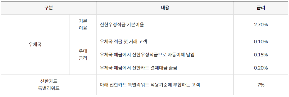 -이 상품의 기본 금리는 연 2.7%입니다. 우체국 적금 첫 거래고객, 자동이체 등 우대조건을 충족하면 최대 연 0.45% 포인트가 추가됩니다. 나머지 7% 금리를 받기 위해서는 신한카드 특별리워드 적용조건을 추가로 충족해야 합니다.